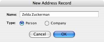 The New Address Record window will appear. Enter the name of the new contact and select whether this is a Person or a Company. This selection is important as it will determine how the cards may be linked in the future. Click “OK” to continue.